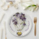 These customisable Easter paper plates feature a cute, vintage image of little, yellow baby chicks in a hot air balloon made from an egg with the basket tied on with ropes full of purple lilies.