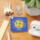 Custom Eat Sleep Repeat Pickleball Keychain features a blue background with a yellow pickleball in the centre of the keychain with the saying "eat sleep repeat pickleball wrapped around the ball. Personalise it with your name or initials in a script font. A great gift for a coach or pickleball enthusiast.