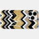 Contemporary white, black, and faux shiny gold glitter chevron zig zag stripes pattern. With room to customise or personalise with a monogram or initial of your choice. Beautiful, modern, and cool cover for the trend-savvy and art-loving hip trendsetter, artsy motif lover who wants to protect their phone from dust and dirt, wear and tear. This design is available in Apple iPhone 6, 7, 8, 10 or X, XR, XS, 11, 12, 13 Mini, 14, 15 Plus, and Pro Max cellphone cases. Show off your style, look fashionable trendy, and feel stylish with a unique design on a mobile device accessory of your choice.