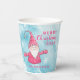 Create unique personalised Christmas paper cups for your family party with an elegant design that features a Merry Christmas saying, cheerful gnome in pink and text templates for the year and Family name. These light blue and pink paper cups with snowy pattern are perfect for winter holidays.