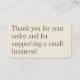 Show your gratitude with this elegant cream thank you label, perfect for small business packaging. Featuring classic serif text and a simple layout, it’s a professional and heartfelt way to thank customers for their order. Ideal for sealing envelopes, packaging boxes, or including in order inserts. Fully customisable to fit your brand’s tone and message.