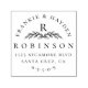 This self-inking stamp is perfect for any couple looking for a personal touch to their post-wedding envelopes! This design features an elegant monogram on top of a beautiful branch base with your first names in a curve around the top and your last name below. Under your last name is your return address. Click the "personalise" button to customise this stamp with your own details.