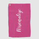 Custom elegant typography pink golf towel for lady. Monogrammed golfing gifts for men and women. Stylish script typography template for name and intitial letter. Luxury Birthday gift ideas for golfer, wife, mum, grandma, aunt, sister, friend, daughter, husband, dad, father, friend, co worker, boss, colleague, coach, instructor, trainer, teacher, grandpa, retired person etc. Add your own name, surname or funny quote. Including hook to hang it up. Unique golf accessories for friends and family.