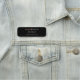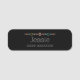 Pretty and trendy name tag that includes personalised text for employee name and title on black background with colourful geometric accent.