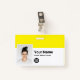 Easily personalise this Custom Employee Name Badge with Photo, Scan Bar Code and business logo, with metal clip included. A simple business design left-aligned in bright yellow and white colours fully customisable in front and back sizes, sans-serif basic and modern fonts and a professional and clear look. Avaiable with or without lanyard, metal clip or with retractable. No minimum order.