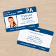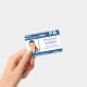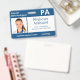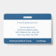 Keep your hospital or medical practice safe with horizontal custom photo ID badges featuring your employee's photo, name, professional job abbreviation, job title, ID number, and business name. You can also include a department. Perfect for a physician assistant, nurse, or other staff. On the back you can add more information, such as where to return the badge if it gets lost. Customise it with a photo and custom text in the sidebar. The square photo on the left has a thin white border surrounded by blue stripes across the top and bottom and thin blue lines by its sides. A white block on the centre right side highlights the job title, ID number, and expiration date in dark blue text. The staff person's name, job acronym, and hospital or business text is white on blue.