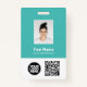 Easily personalise this Custom Employee Name Badge with Photo, Scan QrCode and Bar Code and business logo. A simple business design in fresh light turquoise blue and white colours fully customisable in front and back sizes, sans-serif basic and modern fonts and a professional and clear look. Avaiable with lanyard, metal clip or with retractable. No minimum order.