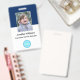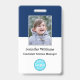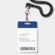 Create your own custom, personalised, durable PVC plastic, won't fade or tear, cool modern trendy navy blue and white, name photo ID badge, with choice of attachments - lanyard, metal clip, retractable, or none. To personalise, enter the name of the employee / staff / executive, their designation, and any additional information like employee ID, issue & expiry date of the badge, if lost return to & the address, etc. Next add the photo of the employee / staff / executive, add the business / company logo, and add the barcode. While you type/design, you'll be able to see a preview of your badge, throughout. Great for small business, corporate, school, restaurant, office, concert, retail, hospital, clinic, and for employee, staff, doctor, teacher, student.