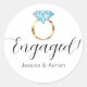 These custom stickers say Engaged! along with a gold banded blue diamond engagement ring and the bride and grooms names on the bottom. Perfect for an engagement party or save the date announcement!