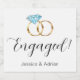 These custom sparkling wine labels say Engaged! along with a pair of gold banded blue diamond engagement rings, and the bride and grooms names. Perfect for an engagement party!