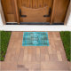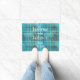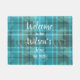 White doormat printed with a teal blue equestrian tartan plais pattern hand drawn by Anne Londez, personalised with your family name and date of establishment. Perfect as a gift for a housewarming party.