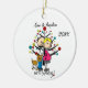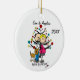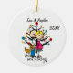 A cute, fun ceramic ornament featuring a stick figure expectant couple, a dog, holiday tree, and text that reads "We're Expecting!" with an area you can add your names or surname and the add the current year!