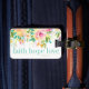 A beautiful floral watercolor luggage tag featuring an excerpt from 1 Corinthians 13:13 "faith hope love" and bright floral hand painted watercolor designs. Customisable with your name and contact info. This luggage tag with a leather tie makes a great gift!