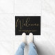 An elegant black and gold doormat featuring beautiful script calligraphy welcome and personalised with your family name and special date. Designed by Thisisnotme©
