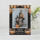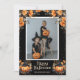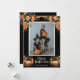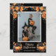 Custom black photo Halloween card featuring a photo adorned with watercolor jack-o'-lanterns wearing black hats, orange flowers and greenery. Easily personalise this cute photo Halloween card with your photo and the family name. This photo Halloween card can be turned into any colour using the customisation tool.