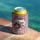 Personalised Christmas-themed can cooler featuring a custom photo, your family name, the year, and an editable holiday message, such as "Merry Christmas". Design with a red and white plaid background. Double-sided.