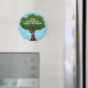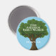 Personalise your sky blue family reunion souvenir magnet with your family's name and year of reunion in white text. A tree is in the background. At the bottom you can add where your reunion is taking place.