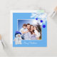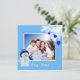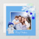 Custom family, white pine ornamented with blue Christmas balls and cute snowman on sky blue Christmas Greeting Card.