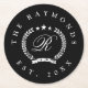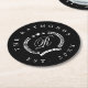 Custom family name round paper coasters with vintage crest design. Black and white monogram design with estiblished date. Elegant decorations for new family home, wedding party, newly weds, engagement, bride and groom, couple, anniversary, bbq etc. Add your own personalised surname and date of marriage. Disposable accessories and party supplies with customisable background colour. Also nice for fancy reunion or gathering. Change quantity to get the cheap bulk price. Classy typography template with rustic wreath emblem including stars and banner.
