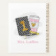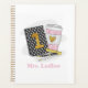 This first grade teacher binder keeps your papers organised. Pattern has a black and white polka dot notebook with a gold one, heart coffee, ruler, pen and pencil. This black polka dot notebook design can be found on other items in my shop, PageCreativeDesigns.