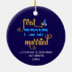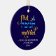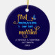Cute FIRST HANUKKAH MARRIED ceramic ornament with CUSTOMIZABLE NAMES & YEAR. Hanukkah is written in Hebrew. Design shows Hanukkah blue handwriting script typography with blue and yellow dreidel. A beautiful souvenir for couples celebrating their first married Hanukkah. Design is repeated on the back. English version available separately. Also in white.