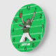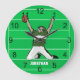 A personalised grid iron sports design with an American football player wearing a green and white football jersey uniform and holding a football. The background has a green striped football field effect with grid lines. It is fully customisable with a name of the football player, grid iron fan or football coach to create a unique football gift.