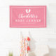 Custom baby shower party banner sign with cute footprints. Indoor and outdoor quality. Elegant personalised pink and white design. Sweet decoration design with baby feet illustration. Stylish brush script typography with chic border. Available in different sizes for inside and outside. Small medium and large shapes. With or without holes and hooks. Pink and white or customisable background colour. Add name or welcome home message to the template. Baby shower accessories with baby steps logo. Gender neutral design for newborn girl or boy. Personalizable decor for new baby and parents (mum dad)