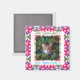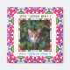 Custom Fun Jolly Red and Festive First Christmas Photo Picture Frame Square Magnet. A colorful and bright fridge magnet. Replace the photo and text with your own pet picture to celebrate your Yuletide memories. Give as a stocking filler keepsake gift to family and loved ones. In warm winter colors of red, green and orange and purple. With hints of icy blue. A budget friendly present for family and best friends. A merry and bright color block pattern frame borders the picture. Based on colorful, traditional designs. Use as a cheap way of decorating the Christmas kitchen or home office. Have a maximalist dopamine decor Christmas!