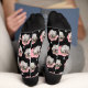 Funny custom dog photo crew socks. Upload your pet's favourite picture and it will automatically be replicated all over the socks, on both sides. Design with a daisy flower-like shape and dots. The black background can be changed to any other colour by clicking the button to edit the design.