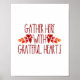 Gather here with grateful hearts in red typography. It is a clean and simple design with two fall colored leaves in hues of gold,brown and red. You can click on the customize button to change the color of the poster to any you choose to coordinate with your current home decor. This design was inspired by the beautiful farmhouse style work of Rae Dunn. See our shop for more products in this collection.