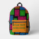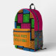 Express your unique style with this customisable geometric backpack. Featuring a vibrant, repeating pattern of abstract shapes in neon colours against a black background, this backpack is a true statement piece. The front pocket offers a perfect space to add your own text, making it a one-of-a-kind accessory for school, travel, or everyday use. Made with durable materials, it combines functionality with a bold, personalised design.