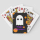 These cute ghost playing cards feature a spooky ghost on top of an orange and black polka dot background. "Happy Halloween" is printed on the front of the playing card in a coordinating purple.