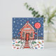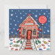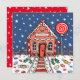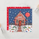 A colorful illustration of a festive gingerbread house. The outside of the house is decorated with two candy canes and has a large lollipop tree in the garden. The ground is covered in bright white icing sugar snow and strewn with sweets.