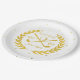 Custom gold golf club paper plates in elegant, modern, minimalist, chic design. Personalised golf club paper plates with laurel wreath, two crossed golf clubs, and golf ball. Personalised golf driver head cover with your logo, name, text, year, etc. Elegant gold golf club paper plates personalised gift for golf club, golfer, golf player, team, coach. Black and White and Gold custom personalised golf club paper plates