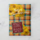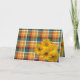 Unique, classy, trendy, pretty and decorative Thanksgiving holiday card. Cute GRATEFUL BLESSED GIVING THANKS text and room to customise or personalise with a photo and names (or family name) of your choice. With cute classic warm yellow fall Mums flowers on a teal blue green, pumpkin orange and dark burgundy wine red coloured rustic farmhouse inspired plaid tartan pattern background design. And a customisable season greeting poem on the inside of the card.