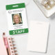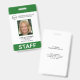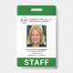 Corporate photo ID badge in a vertical layout. This simple yet professional design features a green border on the top and bottom with white in the middle. The template is personalised with your logo, company name, employee name, title, department / location and employee ID. The bottom border has "STAFF" in large bold letters and may be changed to any title desired. The backside has your contact information and instructions for returning if found. This classic design works great for any type of business.