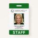 Corporate photo ID badge in a vertical layout. This simple yet professional design features a green border on the top and bottom with white in the middle. The template is personalised with your logo, company name, employee name, title, department / location and employee ID. The bottom border has "STAFF" in large bold letters and may be changed to any title desired. The backside has your contact information and instructions for returning if found. This classic design works great for any type of business.