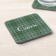 Great looking traditional green, yellow, black, and white Clan Currie tartan plaid coaster, with white custom text ready to personalise. This pretty cork back coaster is a lovely addition to any table. Makes a great gift idea.