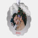 Design a contemporary classic Christmas holiday season ornament card featuring a grey and white plaid tartan gingham style background. This card offers the ability to customise the text, family name, and year date, insert a personal photo on the front, and include a customisable seasonal greeting message on the back.