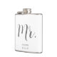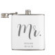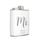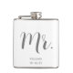 A modern white and grey personalised script custom Mr. Groom name wedding dated flask. Personalise this for a wedding party gift keepsake, and or an engagement gift.