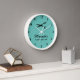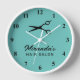 Custom hair salon wall clock with business name. Personalised decor for hairdresser shop. Teal or custom colour. Wood clocks in white, black and natural colours. Elegant design with professional barber scissors logo.