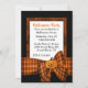Pretty black and orange Halloween party invitation. Graphics of a black and orange frame around a white text field and an orange and black plaid ribbon and bow, at the bottom, with a pumpkin in the middle of the bow. Personalise all the text for your Halloween bash. Suitable for adult and children parties.