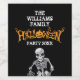 Cool custom annual family Halloween party wine label that features a creepy skeleton hanging over spooky orange and black text and an awesome Jack O Lantern. Customise these labels with your big bash information for all of your guests.