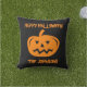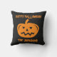 Orange and black carved pumpkin head Halloween throw pillow. Scary jack o lantern face carving design with personalised greeting and family name. Custom home decor for Happy Halloween party night, trick or treat, gathering etc. Cute spooky Holiday decorations for adults and kids. Available for indoor and outdoor. Change quantity to get the cheapest bulk price. Double sided design with two colours or customise bacground colours. Great for outside porch, garden, terrace etc.
