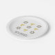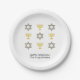 Elegant HAPPY HANUKKAH paper plates showing faux gold and silver STAR OF DAVID and MENORAH in a tiled pattern against a plain white background. Text reads HAPPY HANUKKAH with a placeholder name, and is CUSTOMIZABLE, so you can PERSONALIZE it by adding your name or other text. Ideal for Hanukkah celebrations, and with customisation can be suitable for any Jewish-themed event. Choose from a wide selection of Hanukkah party supplies by Berean Designs.