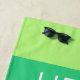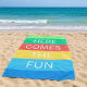 Happy bright coloured beach towel with jade and lime green, coral red, vibrant sun yellow, sky and azure blue stripes pattern, and fun HERE COMES THE SUN quote text. Celebrate summer time... beach time, pool time, fun time!