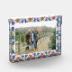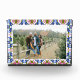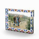 Custom Happy Green Bright Blue Christmas Keepsake Photo Block. A jolly geometric pattern frame surrounds the stock photo of a family in a Christmas tree field. Personalize it by uploading your own photo to celebrate happy Christmas memories. In joyful colors of pretty pink, icy Winter blue and pine tree green. Buy as a cheerful gift for grandparents, new parents, to commemorate a baby’s first Christmas, or just family in general who want to remember the good times. Perfect for people who love maximalism and dopamine decor to decorate their cozy home.