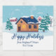 This beautiful custom real estate holiday party champagne bottle label is perfect for a realty company located up north. A beautiful home drawing of a house lined with snow and smoke coming out of the chimney next to green trees. A realtor can keep Happy Holidays in cursive script or customise with their own seasons greetings for Christmas gifts.