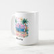 Find your personal paradise with this Personalised 'Meet Me At My Happy Place' Mug! This whimsical design features a vibrant pink and teal camper parked on a sunny beach, complete with swaying palm trees, a sandcastle, and tropical flowers.
