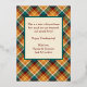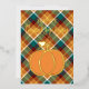 Unique, classy, trendy, pretty and decorative seasonal Happy Thanks greeting card. With room to customise or personalise family name or names, and text of your choice. Cute golden pumpkin on a maroon red, dark teal green, orange and ivory off-white coloured plaid tartan gingham check pattern.